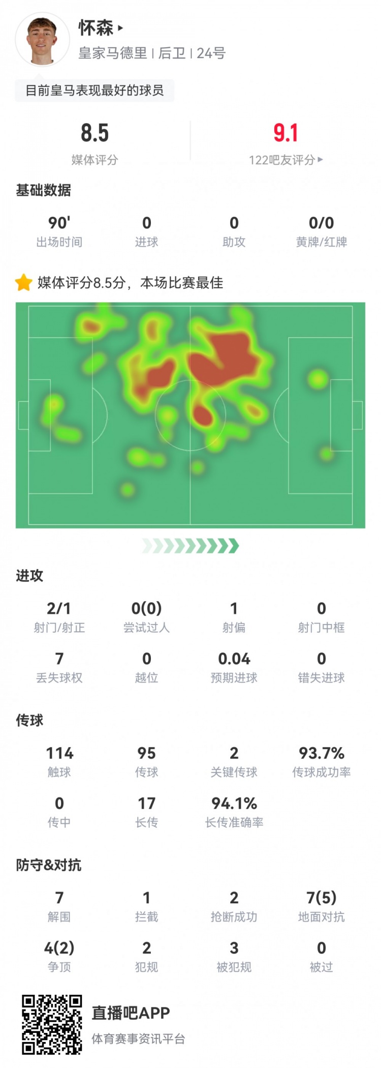 8月20日讯 西甲首轮,皇马1-0奥萨苏纳。此役20岁怀森西甲首秀首发打满全场,球员全场要点数据如下↓