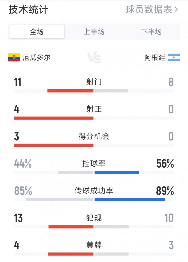 9月10日讯 在本轮南好意思区世初赛,厄瓜多尔1-0打败阿根廷,以下为两边全场数据对比: