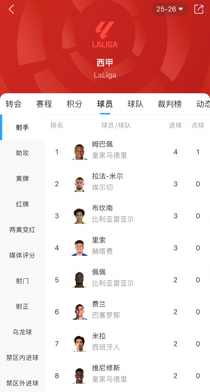 09月14日讯 西甲第4轮,皇马2-1降服皇家社会,姆巴佩传射立功,他四轮打入4球领跑西甲弓手榜。