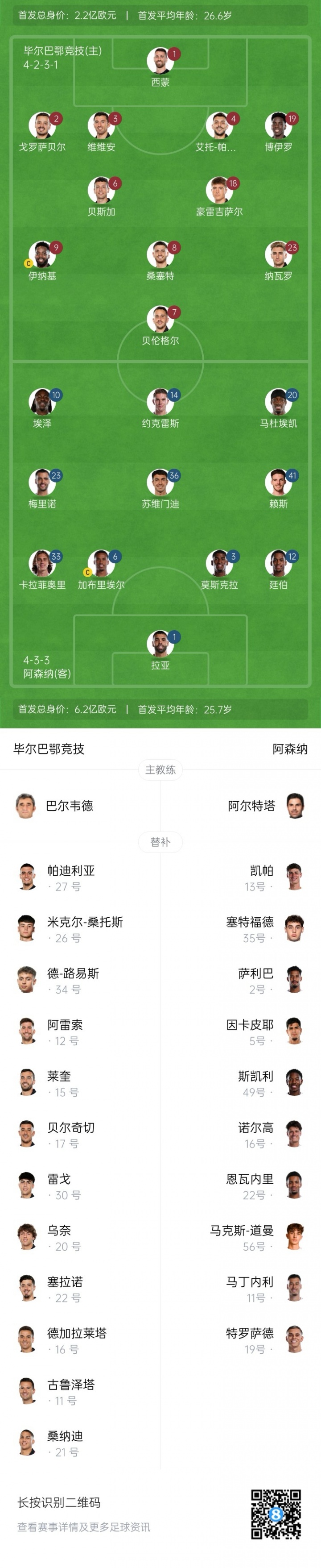 毕尔巴鄂竞技首发:1-乌奈·西蒙、2-戈罗萨贝尔、3-维维安、4-艾托·帕雷德斯、19-阿达玛·博伊罗、6-贝斯加、18-豪雷吉萨尔、8-桑塞特、23-纳瓦罗、7-贝伦格尔、9-伊纳基·威廉姆斯