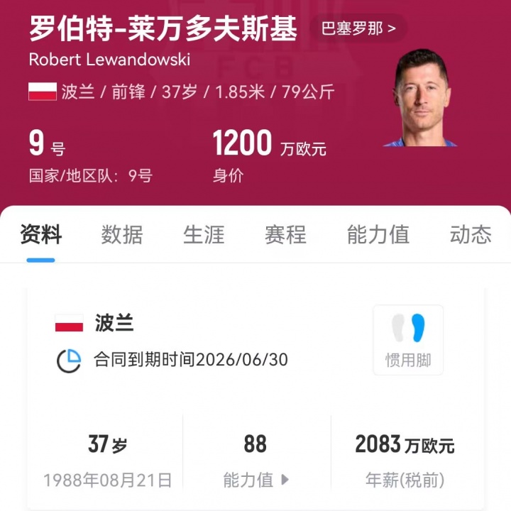 09月30日讯 当今37岁的莱万多夫斯基当今与巴萨的条约还是干与临了一年,将于2026年6月30日到期。