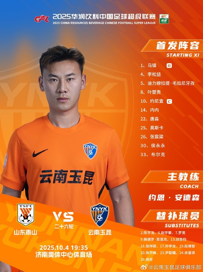 山东泰山vs云南玉昆 本场比赛首发威望出炉