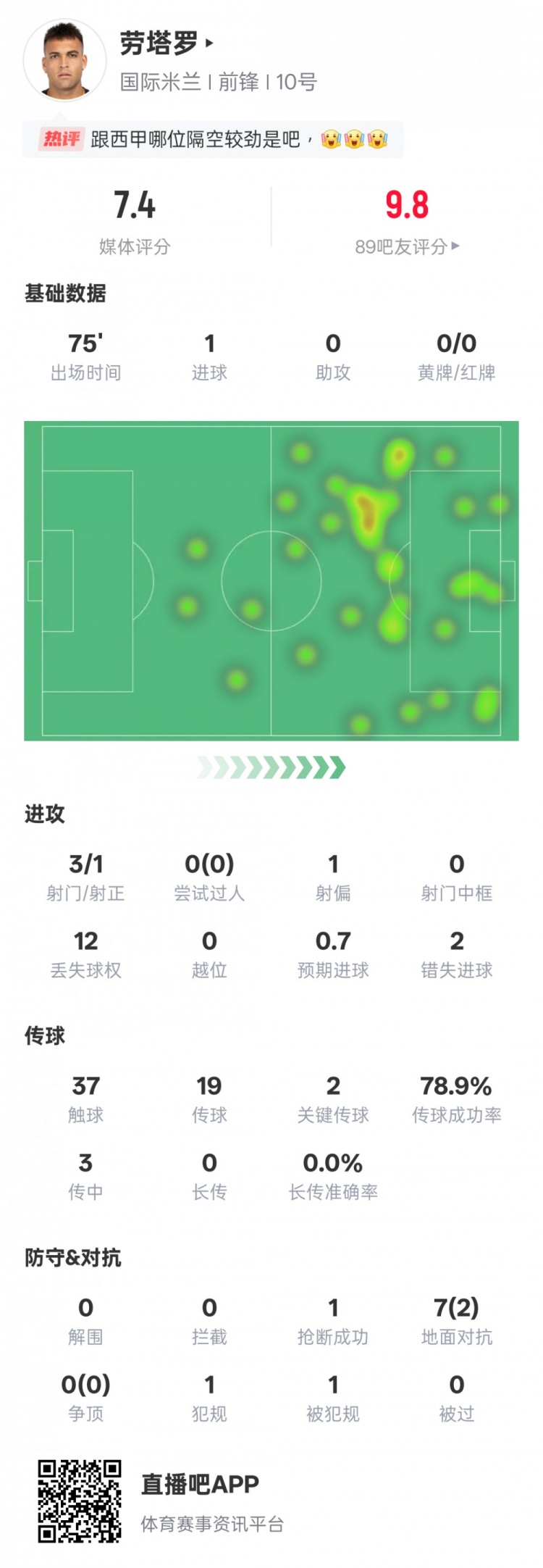 劳塔罗本场比赛数据如下: