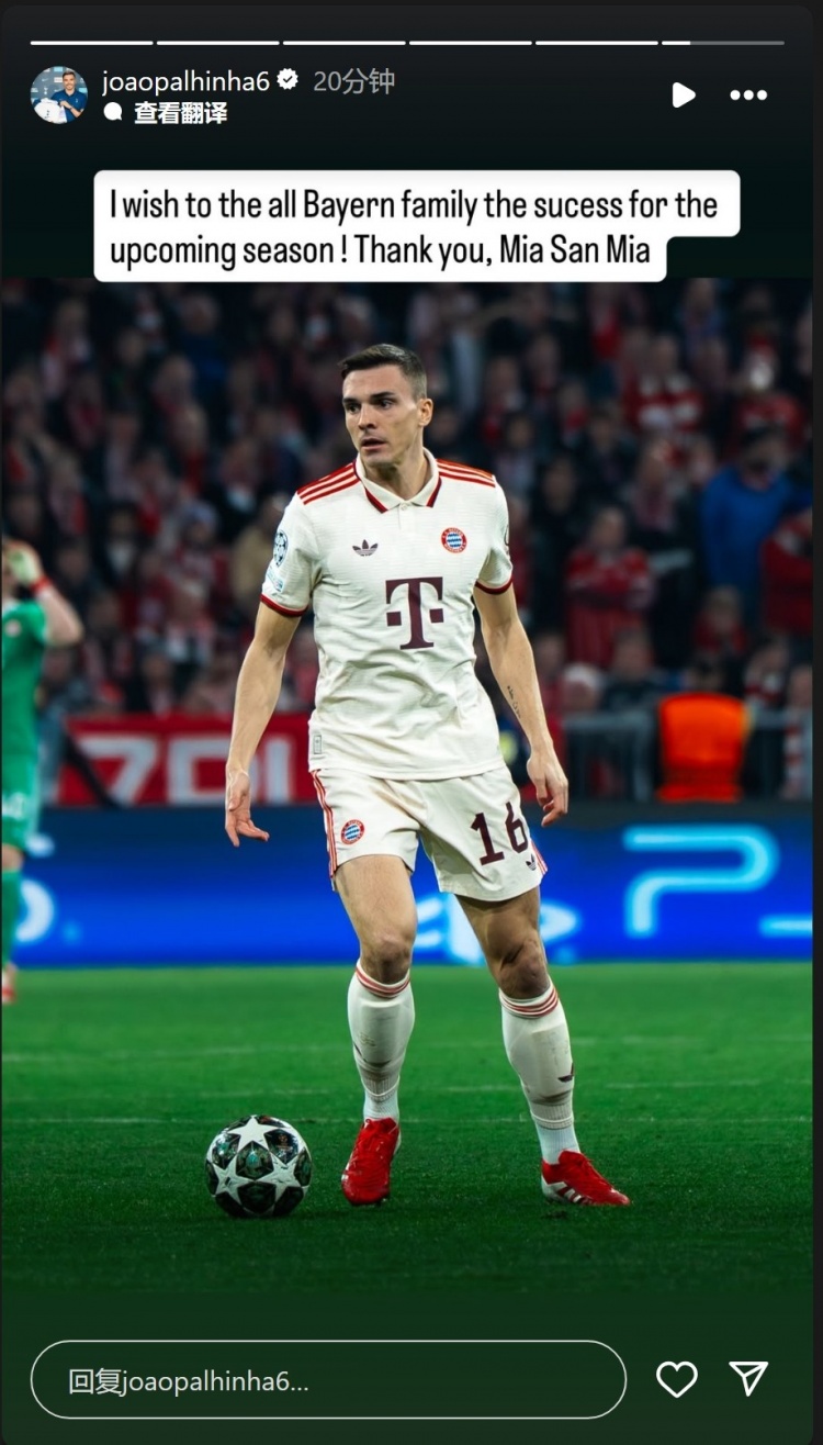 帕利尼亚社媒晒成就穿拜仁球衣的比赛像片,配文:“祝愿拜仁人人庭在行将到来的赛季中得到得胜!谢谢人人,Mia San Mia”