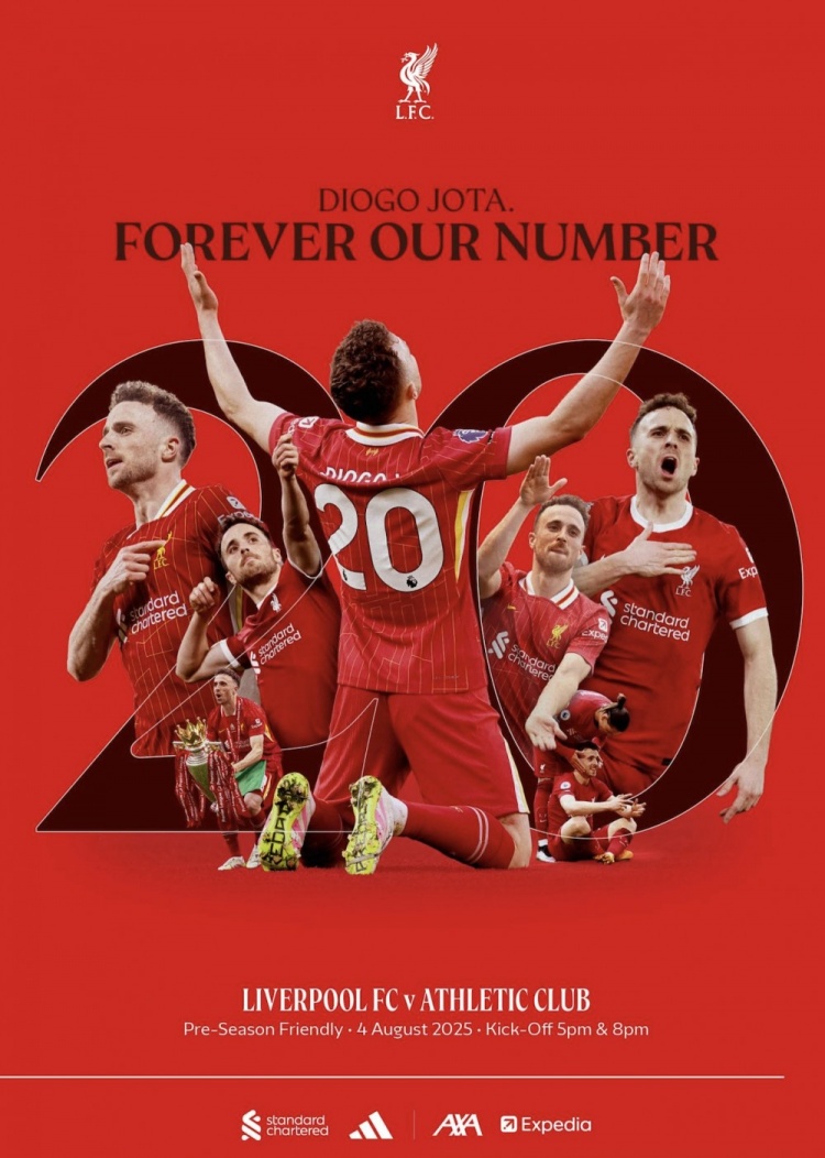 在2025-26赛季安菲尔德首场比赛日的特刊封面上,非常向若塔致意!他是恒久的利物浦20号球员。