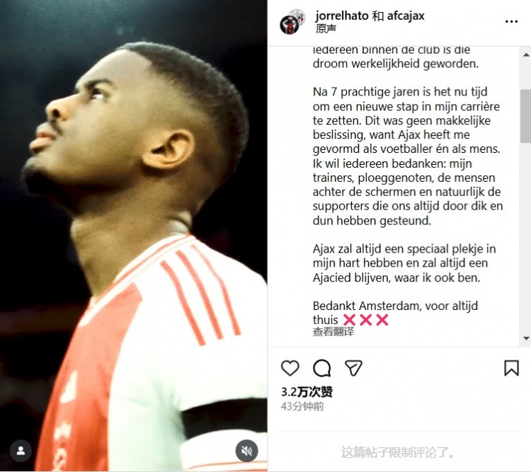 无论我身在那儿,阿贾克斯王人将长久在我心中占据独特的位置,我也将长久是别称阿贾克斯东谈主。谢谢阿贾克斯,这里长久是我的家!