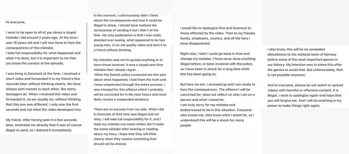 我也深知,这将在挪威国度队迎来史上最挫折赛事之际,变成无须要的阻挠。我本筹办在赛事截止后公布此事以幸免影响,可惜已无法达成。