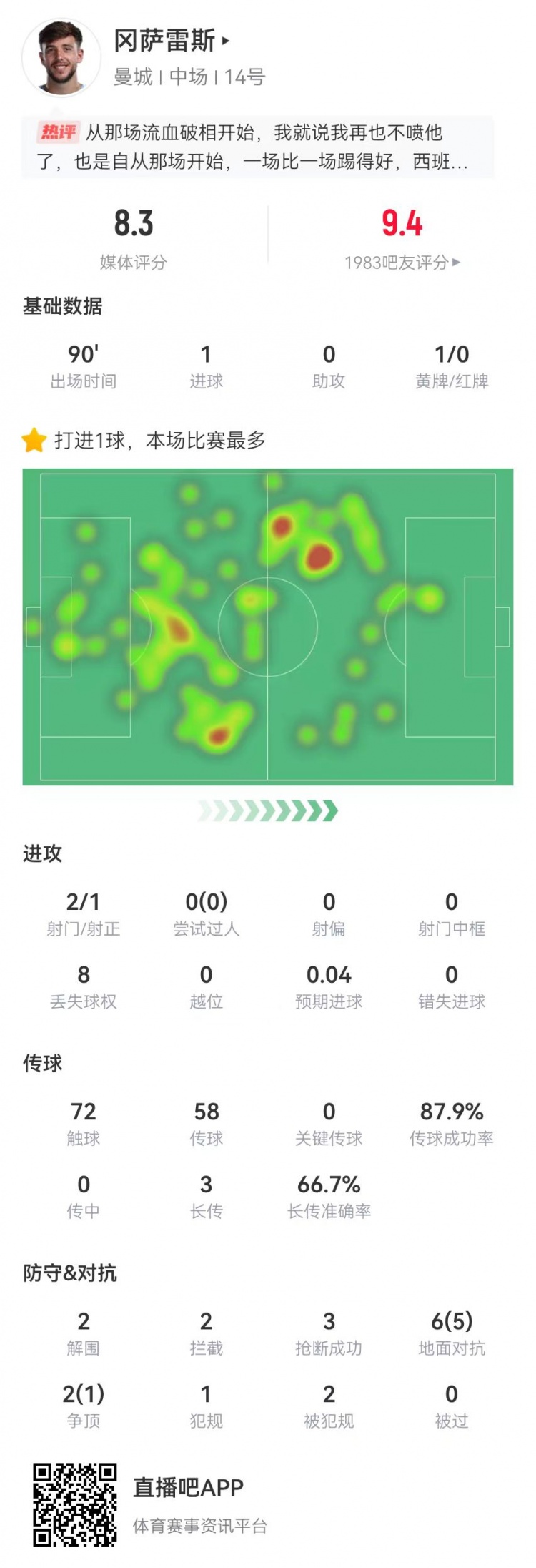 11月10日讯 曼城在本轮英超焦点战3-0完得胜物浦,尼科-冈萨雷斯本场数据如下: