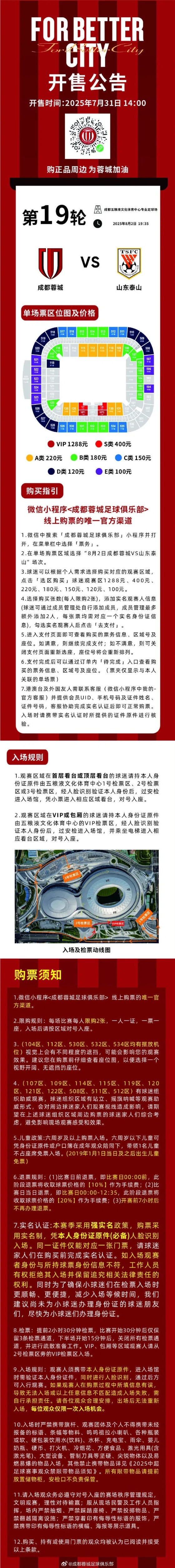 本日14:00,成王人蓉城vs山东泰山主场比赛球票线上开售,请诸君球迷家东谈主定好闹钟!线上购票联系购买应知、优惠群体计谋、进场及检票神色等信息请通过图片笃信了解