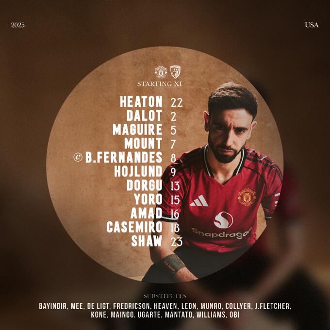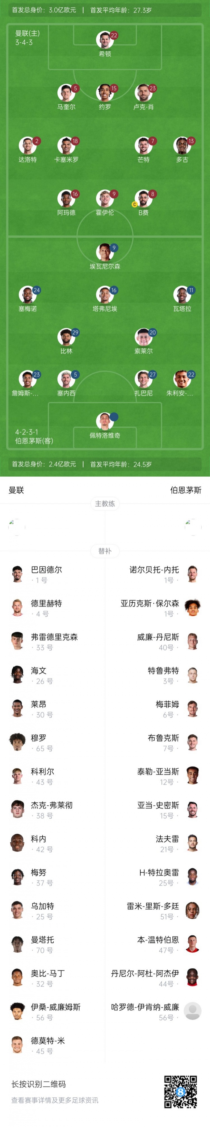 曼联首发:22-希顿、2-达洛特、5-马奎尔、15-约罗、23-卢克-肖、13-多古、18-卡塞米罗、7-芒特、8-B费、9-霍伊伦、16-阿玛德-迪亚洛