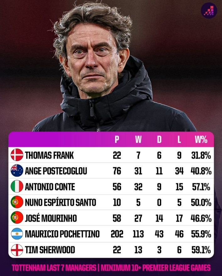 直播吧1月19日讯OPTA清点了热刺近7位主帅(至少持教10场英超)战绩,其中弗兰克胜率仅31.8%最差,具体如下: