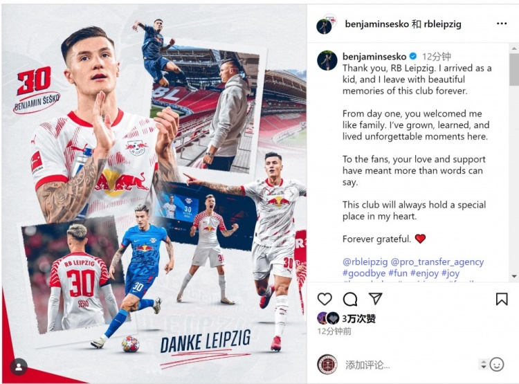 8月9日讯 莱比锡前卫塞斯科转会曼联,塞斯科更新社媒动态,与莱比锡告别。