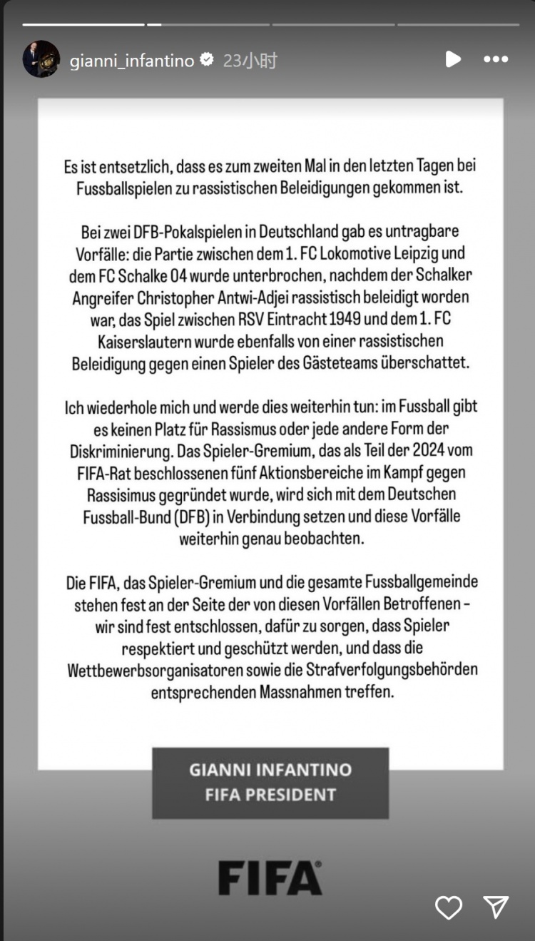 8月19日讯凯 海外足联主席因凡蒂诺更新社媒动态,对德国杯种族懊恼事件发声。