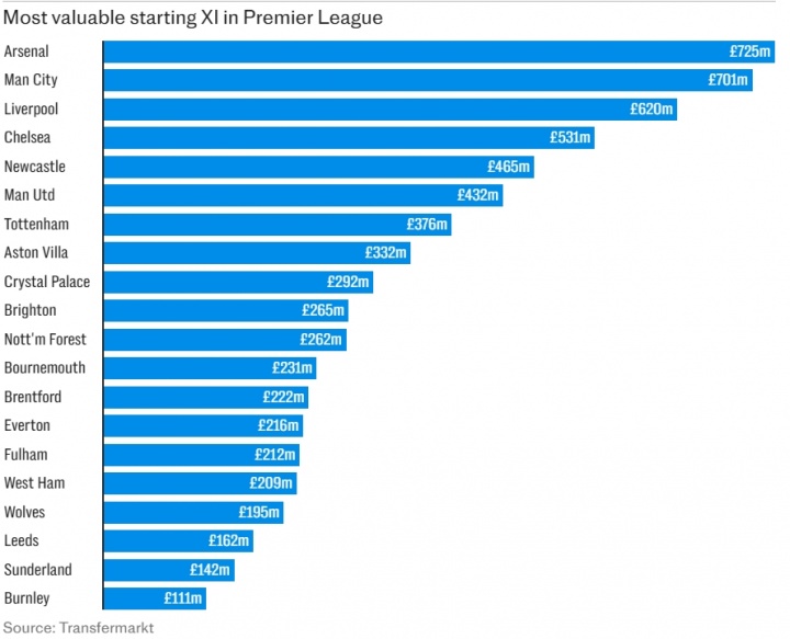 英超各队首发身价(单元:英镑)