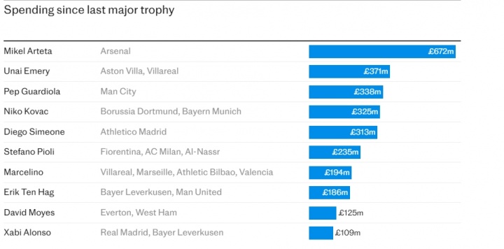 这引出了另一个流传的表格。一样,这对阿尔特塔的评价不利。德国转会市集编制了一张图表,暴露自阿尔特塔上一次赢得奖杯以来,他在欧洲教悔中破耗最多,总和达6.72亿英镑。