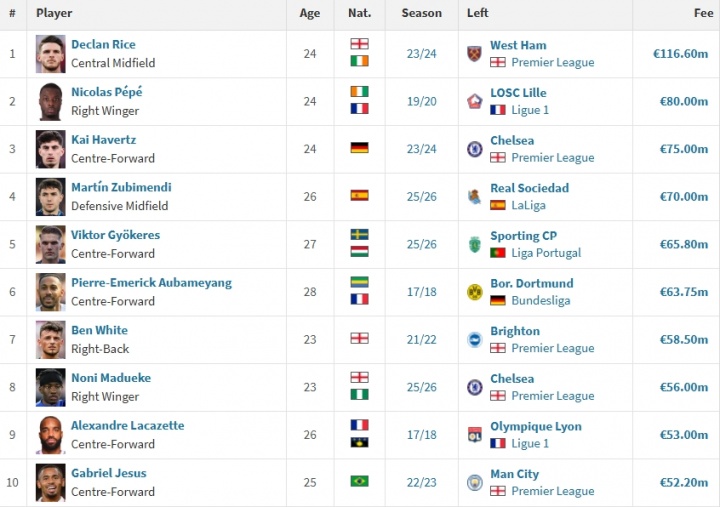 阿森纳历史引援榜(德转数据,仅计较固定用度)