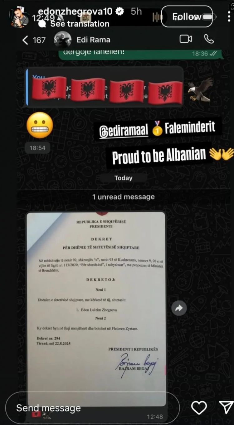 “为成为阿尔巴尼亚东谈主感到自豪,”哲格罗瓦在他的最新Instagram故事中写谈。这位26岁的球员通过父母领有科索沃-阿尔巴尼亚血缘。
