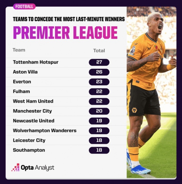 8月27日讯 在英超历史上,有一些球队时常会成为临了一分钟被绝杀的配景板。OPTA清点了英超历史临了一分钟被绝杀次数最多球队top10,热刺27次居首。