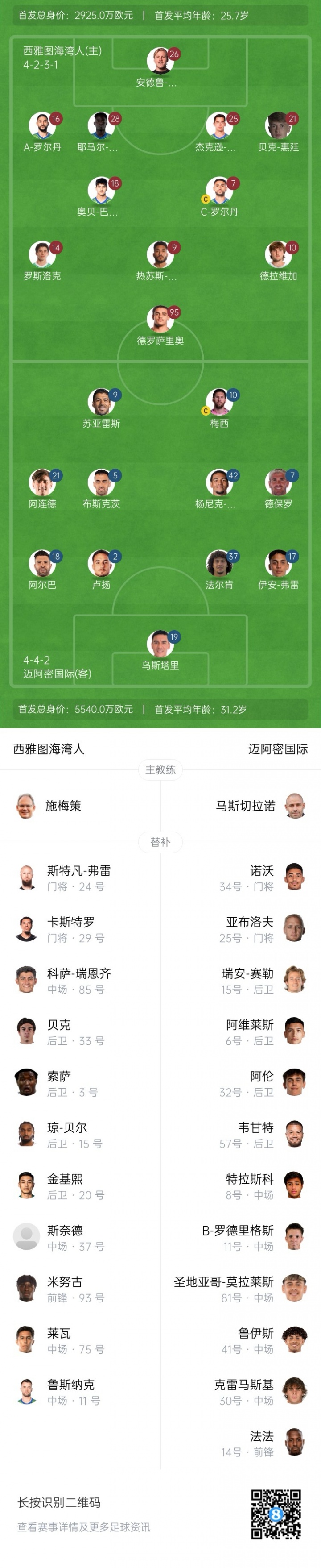 09月01日讯 定约杯决赛,西雅图海湾东谈主对阵迈阿密海外,赛前首发公布。
