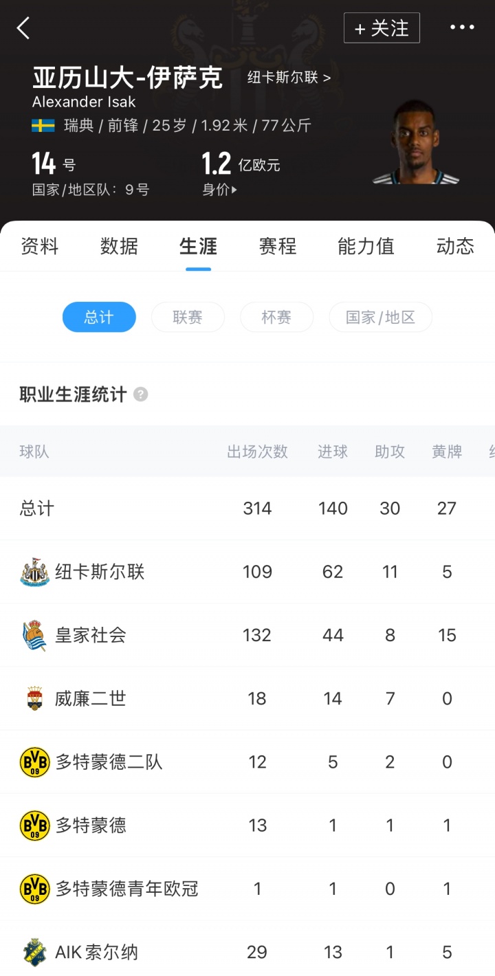 伊萨克现年25岁,瑞文籍先锋。上赛季他为纽卡出场42场,打进27粒进球并得益6次助攻。现在其德回身价为1.2亿欧。