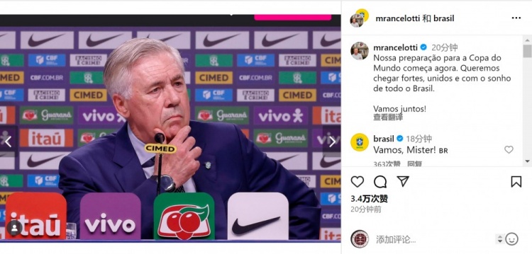 安切洛蒂社媒晒我方在新闻发布会中的像片,并写说念:“咱们的宇宙杯备战当今运转,咱们但愿以高大的实力、互助的精神、肩负着统共巴西的梦思出征宇宙杯,让咱们沿路加油!”