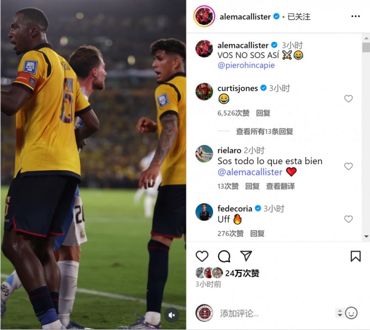 本场比赛伤停补时阶段,厄瓜多此后卫因卡皮耶禁区内破损马斯坦托诺的契机,并寻衅这位小将,麦卡利斯特冲上来与因卡皮耶坚持并争吵。