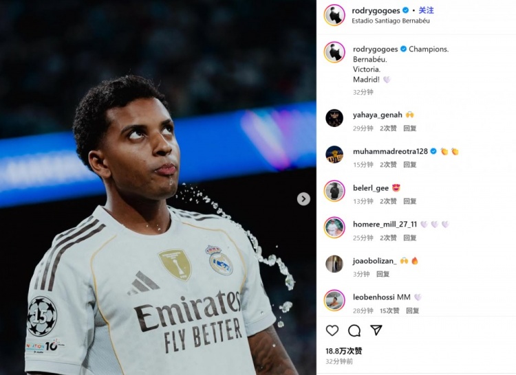 他也在赛后通过社媒晒出我方的比赛照,并配文:“欧冠、伯纳乌、得手、马德里!”