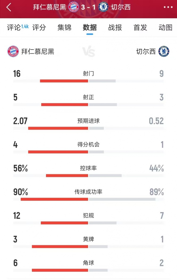9月18日讯 拜仁在本轮欧冠焦点战3-1力克切尔西,两队全场要害数据如下: