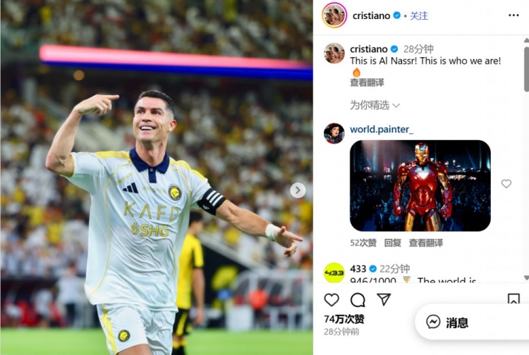9月27日讯 在利雅得成功2-0打败吉达蚁合后,C罗更新了酬酢媒体。