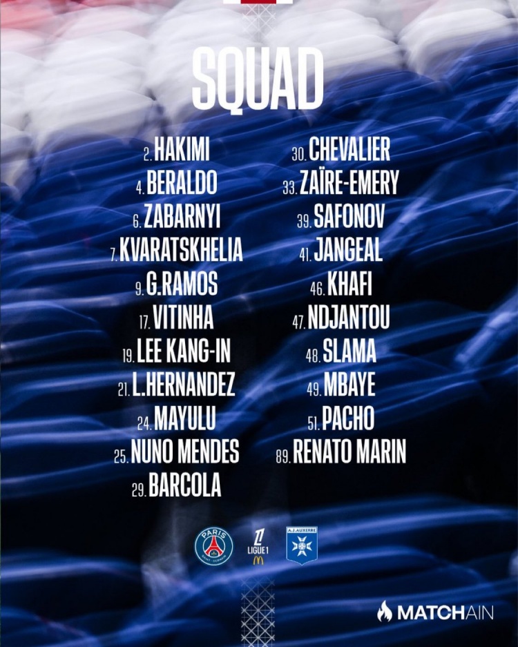 时尚:7-克瓦拉茨赫利亚、9-贡萨洛-拉莫斯、19-李刚仁、29-巴尔科拉、41-詹格尔、47-恩贾恩图、49-姆巴耶