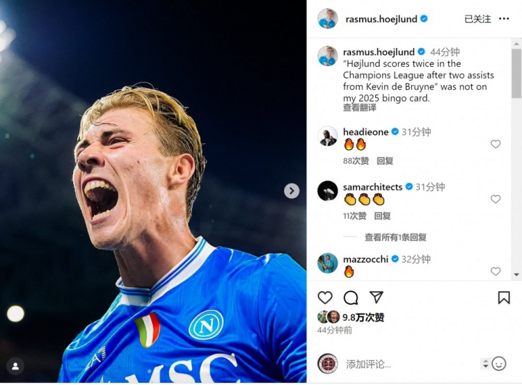 霍伊伦社媒晒出庆祝进球的像片,并发文玩弄:“霍伊伦在欧冠比赛中梅开二度,还齐是德布劳内的助攻——这齐备不在我2025年的脚本之中。”