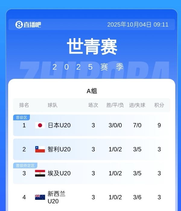 3轮小组赛事后,日本全胜进7球0失球晋级。此前两轮小组赛,日本2-0赢埃及、2-0打败智利。