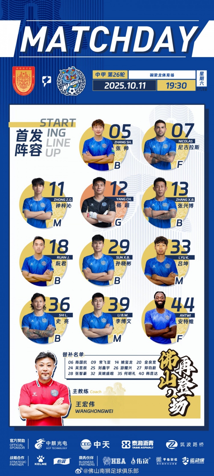 中甲联赛第26轮,重庆铜梁龙vs佛山南狮首发名单