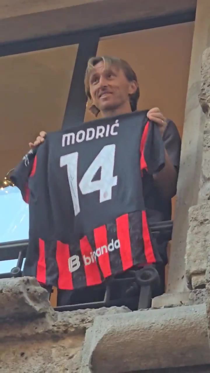 莫德里奇向窗外球迷展示了我方的14号球衣,整条街谈都被狂热的米兰球迷所占据,他们皆声高喊着莫德里奇的名字卢卡。