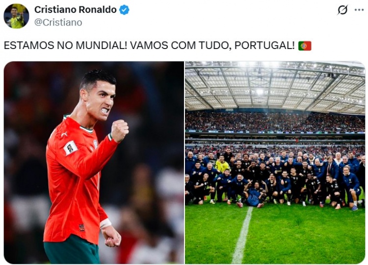 C罗本场因停赛缺席,他在比赛罢休后也在社媒晒出全队合影,配文写说念:“咱们晋级宇宙杯了!加油,葡萄牙!”