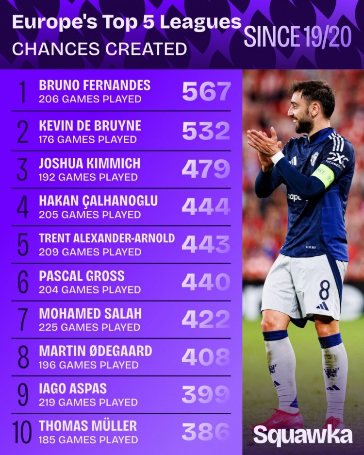 11月19日讯 曼联中场B费在球场上展示出了额出门色的创造契机才智,字据Squawka的数据统计,2019-20赛季以来,B费是五大联赛创造契机最多的球员。