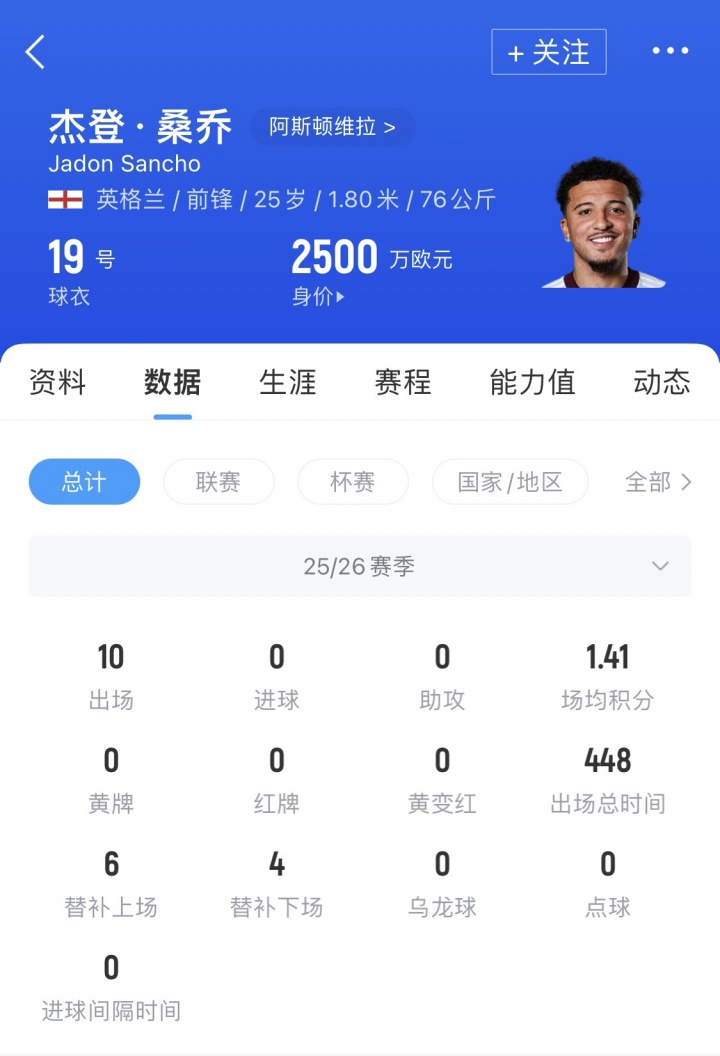 今夏租赁维拉于今,25岁的桑乔各项赛事出场10次,0球0助处境窘态。此前据《邮报》的报说念,桑乔租赁技艺,维拉需承担其25万英镑周薪的80%(即20万镑)。